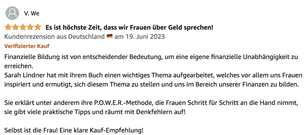 Es zeigt, was passiert, wenn frau auf einmal offen über Geld spricht, auch in der eigenen Partnerschaft und welche nachhaltigen Erfolge sich einstellen, wenn sie regelmäßig die vorgestellte P.O.W.E.R. Methode anwendet.